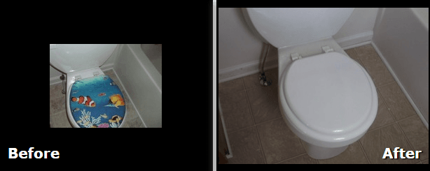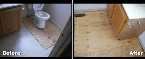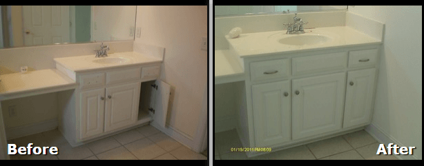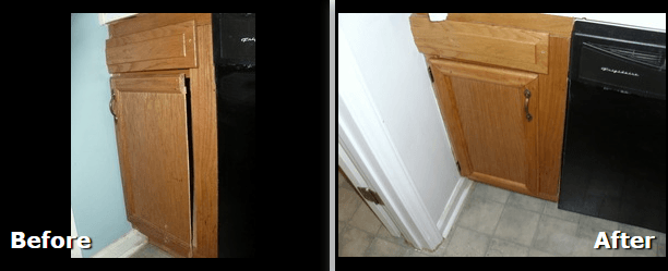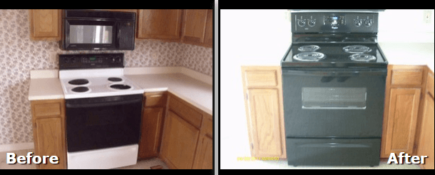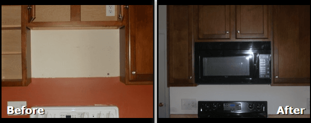 In the before picture the kitchen is missing a microwave hood. We installed a new microwave to match the new black oven. Cabinet doors were also added.