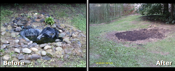 This hole was once a pond. It was left in the yard as an unfinished project which also posed a safety hazzard. We filled in the pond making it level with the backyard.