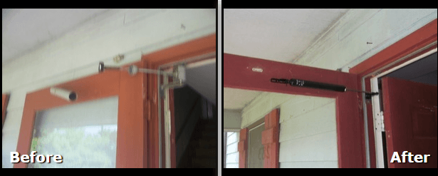 The hardware on this storm door was broken and allowed the door to swing all the way open, making it likely the door and house would be damaged. PM&R by Alert Construction replaced the hardware with a new set and the door works properly again.