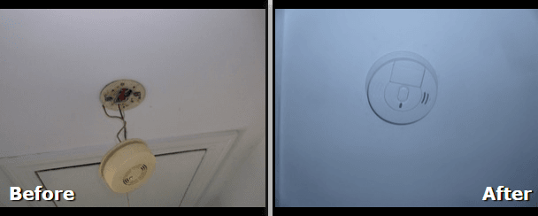 This old smoke detector was hanging from the ceiling. PM&R Alert replaced the unit with a more modern, updated unit, and remounted the smoke detector so it no longer hangs dangerously.